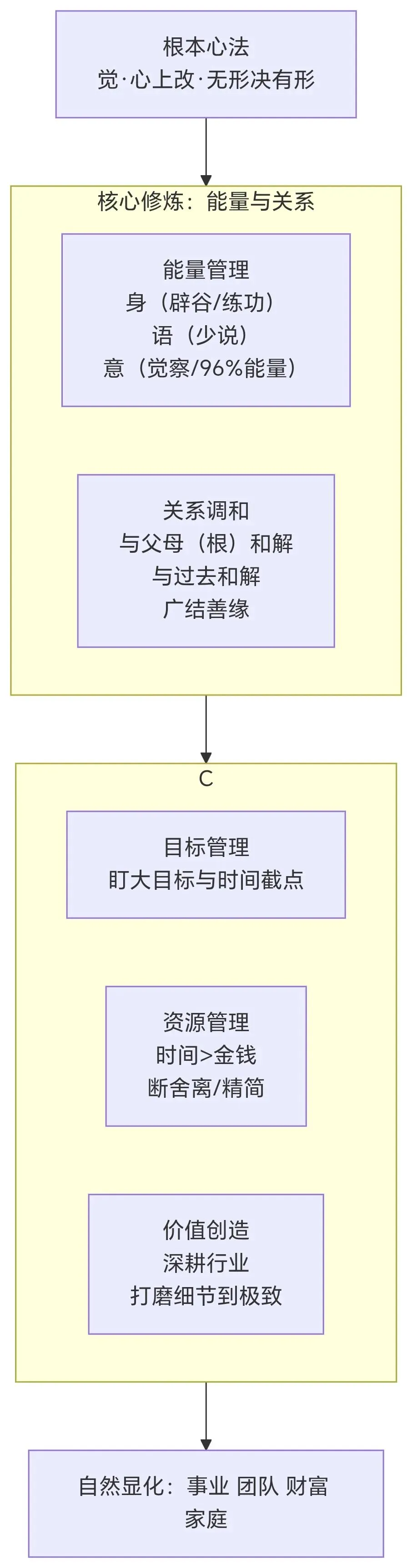 B1[能量管理<br>身(辟谷/练功)<br>语(少说)<br>意(觉察/96%能量)]