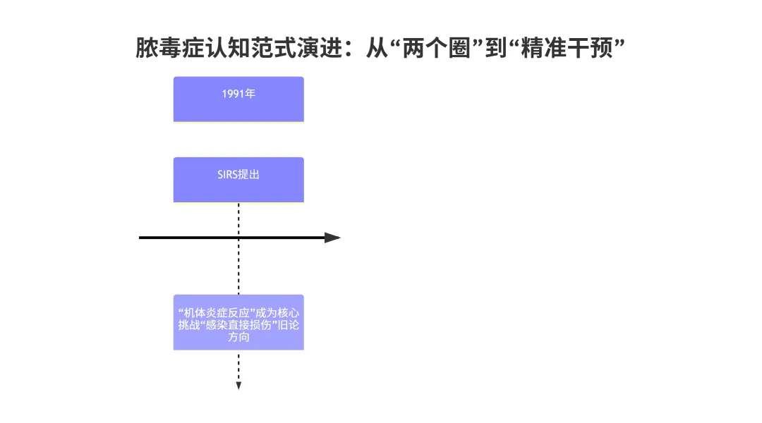 说到这儿呢,跟大家一块儿复习一下,毕竟咱们这么走过来,我今天主要是来抛砖,后边还有专家们一个一个位点的去讲,我们可以看一下跟临床相关的东西,咱不说文艺复兴那个时候,那个时候我也说不清楚,跟我们临床相关的大家就都知道了。我记得 1991 年最开始读到全身炎症反应综合征(SIRS)的时候,我们实际上面临着非常重要的挑战,那也是最开始提出 SIRS、提出炎症反应综合征的时间,我记得当年这个概念受到了外科大夫非常强烈的攻击:你们说是自己的身体把自己给弄成器官衰竭了,那感染呢?你们就认为感染就没关系了吗?这些问题在当时都是很严峻的问题。当然你今天说,好像我们有 1 万句话来回怼回去,但是那个时候这个概念确实有很大的冲击力。