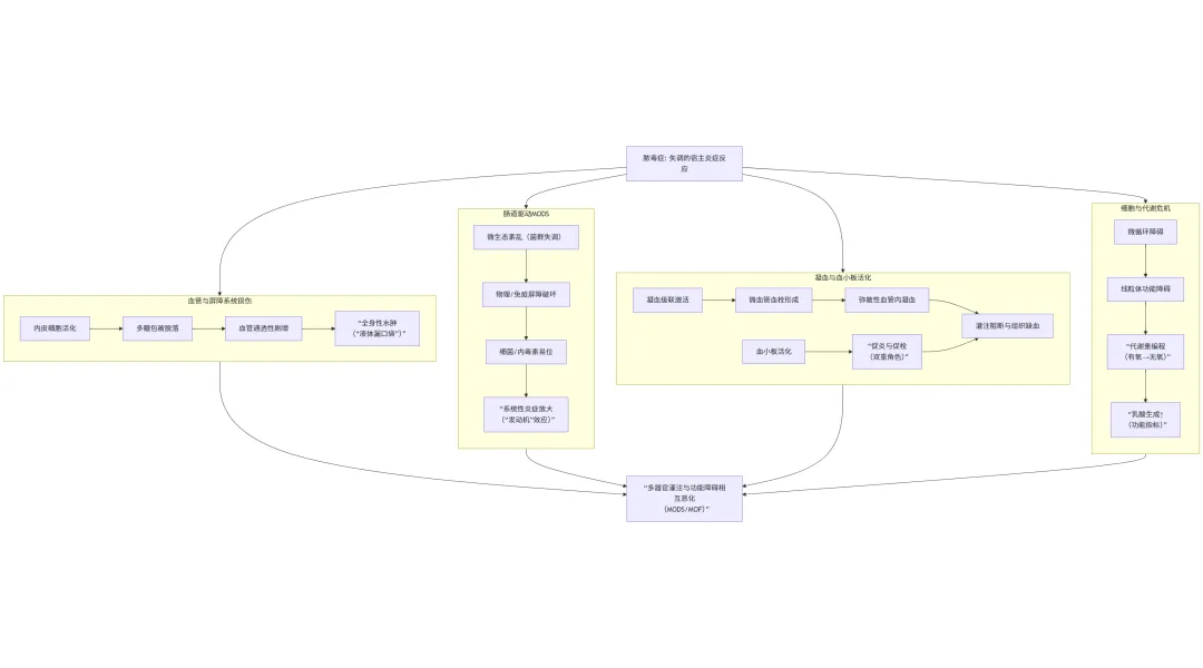 核心:感染触发机体异常炎症反应,进而引发血管内皮、微循环、肠道屏障、凝血、线粒体等多层面损伤,最终导致器官功能障碍。