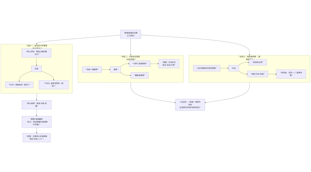 •血流动力学管理:临床核心为增加心输出量,而非单纯补液,补液仅为基础手段,需结合前负荷指标(CVP、下腔静脉变异度)判断终点。