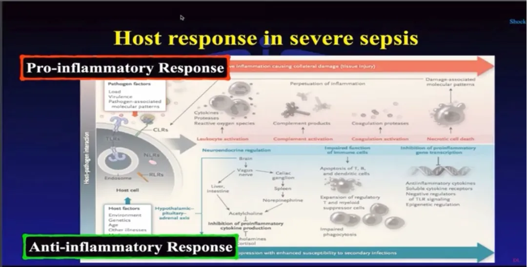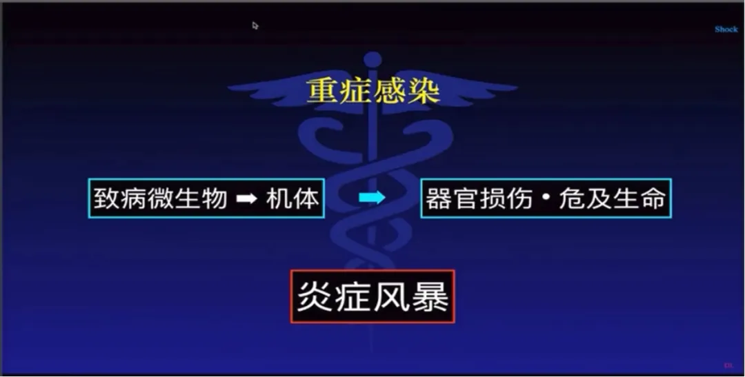好了,我今天主要来跟大家讨论一下,把这么复杂的东西画条线,把它跟临床联系起来。刚才说我们说到重症感染,重症感染就是感染很重了,但是我还是建议大家想到重症感染的时候,一定把脓毒症单独来考虑。我们老在说一个炎症风暴,特别是 SARS 的时候,当然新冠的时候也同样是,那段时间好多人都在说炎症风暴,那炎症风暴怎么了?炎症风暴实际上不是现在才说的,如果从源头说起,人家 1991 年就在说炎症风暴了,我们现在出个新冠就说炎症风暴,好像我们就又退回去了,就是你一定得把这个概念的位点说清楚,那你现在能落实下来吗?