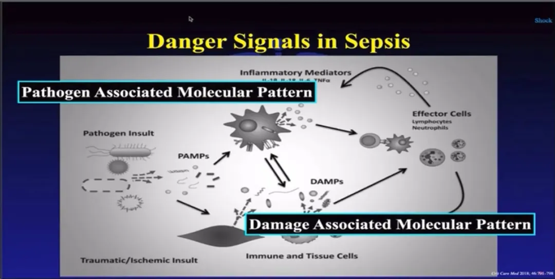 所以你看这一来,就使我们原来想的挺简单的事情变复杂了,说到 SIRS 已经很复杂了,那我把炎症介质都清除出去,那这件事情就解决了,后来发现清除出去仍然还不行。好了,那现在大家最近这些年讨论的是什么呢?就是说整个这个炎症反应,从分子的角度、从细胞这个层面,它的类型是由病原菌直接引起的,还是由于机体损伤和病原菌损伤了之后导致的分子学机制引起的,想办法把这个分开。大家说现在干嘛要干这事呢?实际上还是因为炎症反应这块太复杂了,牵扯的问题太多了,那一定得把它落到临床上来讲,那这一块的东西,我相信现在仍然是在这个层面上在研究。