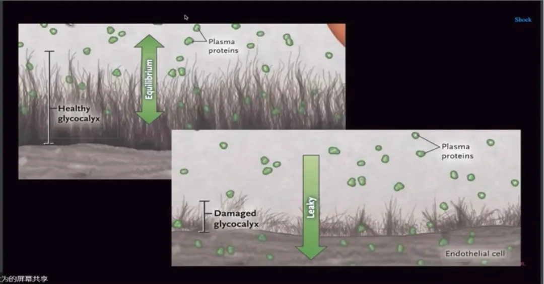 但我发现其实是在我们感染性休克的患者当中,它也存在这种现象,但是好像没有相关的文献在说这件事情。但是我又刚刚给你讲的就是血管通透性,以前我是这样理解,就是说在感染性休克的话当中,在早期的话呢,我们的比如说血管内皮细胞间连接消失了,它那个渗透性增加了,我们补补液以后都流到外面去了,所以说你补的液体越多的话,到组织间隙的越多了,然后就漏的越多了,这样的话呢就会形成一个恶性循环。但是我也在想啊,我们怎么去终止这个恶性循环呢?