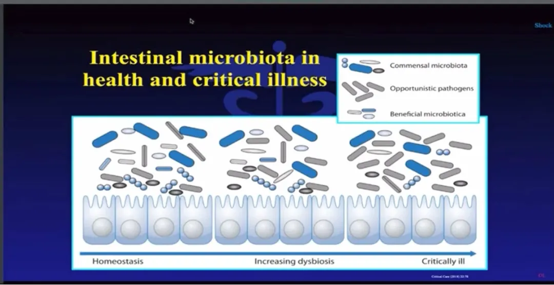 当然大家也许会想着,这个东西你们光做研究了,我们现在临床上好像还没用到,但是它在潜移默化的往前再走,是吧?就是我还是我说的,我们是在进步,我们是在跟那个真理越来越接近,我们会出来新的东西。而正因为这个样子,正因为我刚才说到有这个内皮细胞的问题,又说到你比方说这种细菌的微生态的环境,这种环境呢会带来什么?比方说肠道的怎么能够恢复它的屏障功能,所以这样的东西回来了。因为脓毒症的多器官功能衰竭,实际上大家知道最早就提出来肠道可能是个发动机,那这个发动机是怎么回事呢?实际上说到肠道的细菌是肯定存在的,特别是结肠里边,那么但是在这里头屏障的功能,那这屏障的功能怎么去帮助他恢复呢?那当然这也是肠绒毛的上皮了,这个不用多说,它下边才是血管的内皮。