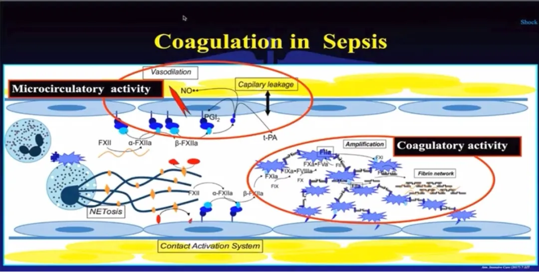 那包括这种内环境,不仅仅是肠道的菌群的问题,脓毒症是方方面面的,包括对血液系统的影响。那么脓毒症的病人,实际上病人没有活动性的出血、没有实际上的红细胞的丢失,那在这个里头它也是会有贫血的,那还有出凝血的问题,那出凝血的问题,我觉得是非常有意思的事情。实际上我出凝血的那个级联式的反应,我们在做学生的时候学病理生理、学生理的时候,老师就在讲,那实际上今天我觉得他应该是我们说的这种机体反应、包括 SIRS 这个整个过程的其中的一部分,或者说是其中的一个分支。那在这个里边去考虑整体的问题,比方说凝血功能障碍,然后甚至发展到 DIC,实际上是当成这样一个病来在学习、来讨论了,是吧?但是把它放到炎症反应的这个层面里来,是完全能够讲得通的,所以从这个里头,包括这个里头跟组织灌注都是非常非常相关的。