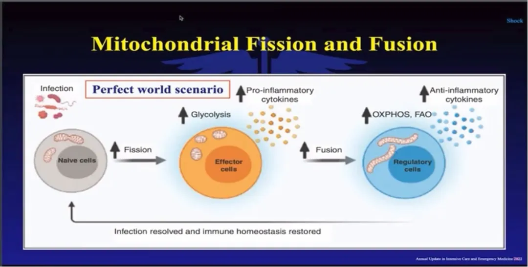 好了说到这儿,一直如果顺着灌注这个角度来说,说到最后是说到线粒体那去了,都走到细胞里边去了、都走到细胞器里边了。大家真别觉得线粒体离我们很远,那么我们现在用的乳酸,已经是个临床上非常常规的指标了,那乳酸这个指标实际上就是跟线粒体相关的这样一个指标,严格的来讲,乳酸是个功能指标,它并不是一个跟灌注直接相关的指标。讲临床的时候,我跟大家说 ICU 的思维的一个特点:乳酸升高唯一的理由,ICU 里的病人急性乳酸升高,唯一的理由就是灌注相关的乳酸升高。但是咱要是想到病理生理的这块,实际上乳酸是个功能指标,是因为没有氧,那些东西进不到三羧酸循环了,在外头形成了乳酸,让乳酸能够给你提供点热卡。
