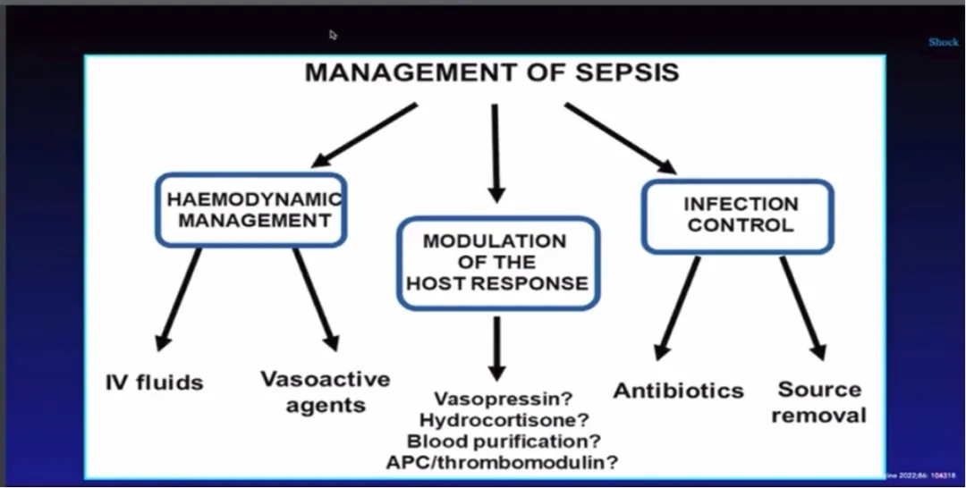 好了,举了刚才那么多的病理生理的例子,咱得回到临床上来,脓毒症应该怎么治?那实际上有很多的专家,尤其是以路易温桑为代表的这样一个专家,你说复杂是很复杂,说回来说到基本的关键的梗概上,分成这样三个方面:这边是血流动力学的管理,因为灌注、循环、流量这样的东西是我们区分不了的,正因为有刚才这样的问题,我们目前来讲,分不开灌注和器官功能,你一说到器官功能要回到临床上,它一定是跟灌注是捆绑在一起的,所以我很不敢说我改善这个功能,我只敢说我想办法去改善它的灌注,就像我刚才在说乳酸似的,乳酸实际上我认为它是个功能指标,但是你要把它变成临床语言,它就是跟灌注相关的。然后还有一个是我们刚才说的这一套炎症反应,因为器官功能改变是因为它导致的。当然你要想搞定这感染源的控制,因为感染源的控制是临床上这么多年全在做,当然最近也在进展,而且其他的兄弟学科也在做,甚至人家有的兄弟学科可能比咱们还做得好,那当然这块,我觉得我们不应该能够输给别的学科,但是这一块他为什么把它放到后边呢?我理解是因为这块的东西呢,我们能够去借鉴人家的东西可能会更多。