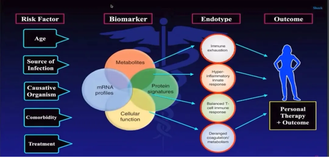 所以回过头来说,我们说到精准医疗,精准的重症是啥呢?那你得一定得说到,我能够给我一个位点,我就打那个地方,就像肿瘤似的,给一个靶向的药物,那我这个靶向的点在哪儿呢?所以脓毒症我们实际上说的是这样的一个东西,但是这一块呢,我觉着现在大家注意到研究实际上越来越倾向于我们可以去做,包括比方说我们刚才说的应激反应,应激反应是个概念,那这个概念实际上就包括了下面有很多的机体的反应,那在不同的阶段上,我们应该怎么做?那大家注意到有那么多的指标,那那些指标我们用来干嘛?因为指标太多了,所以现在大家会用到大数据、计算机的模型了,为什么呢?是想把它一个一个找到这样的位点、找到我们这个靶向。
