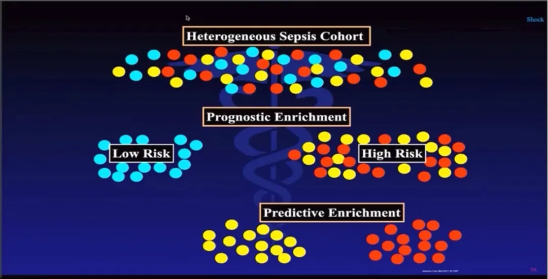 那说到这样的一个亚学科也好、亚专科也好,我觉着临床操作上,实际上就是我们现在大家都在常规说的这个富集性的这种研究方法或者是个策略,我不在这展开讲了,他实际上说的是什么呢?比方说我们脓毒症有这么一堆的病人,大家说这个脓毒症他是一个多因素的、牵涉到方方面面的,那你能够找出来它的关键的点,把它分开一部分吗?那无论你是按预后、你还是按照危险的程度,那你能够区分吗?然后你逐渐逐渐的区分出来了之后,那你可能就变成这个样子了,那如果你要真能分成这样的一个纯粹的这样一组,想到过我们现在会面临什么问题吗?个体化治疗跟群体化治疗就一样了,你的指南才真正说我的循证医学就是个个体化,因为你这些病人完全都是相同的,是吧?