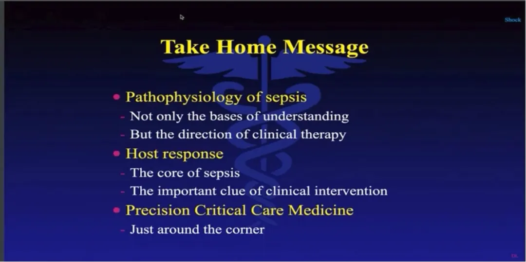 沈主任:谢谢大为老师,那么从这个脓毒症的病理生理的角度,给我们上了一场非常非常生动的课,确实挺复杂的啊。复杂呢一个是本身它是这个疾病本身很复杂,那么其实脓毒症我们谈的非常非常多,但是永远似乎都谈不清楚。那今天大为老师从病理生理角度,从我们最初 1991 年我们那个 SIRS 开始,我们从他的这个动态的演变,从促炎抗炎开始,谈到我们的损伤机制,把一个病原损伤的机制和我们病原相关的这个分子模式,以及我们损伤相关的分子模式,其实最后讲到了这个病理生理它是一个全身的改变,是吧?不管有我们的肺、我们的心脏、还有我们的血管内皮、还有我们的凝血免疫等等,非常非常的复杂,那么讲的也还有我们的胃肠道、这个微生态。应该说我们身体里面的所有系统,都被我们的这个脓毒症所牵连,所以它是个很复杂的东西。