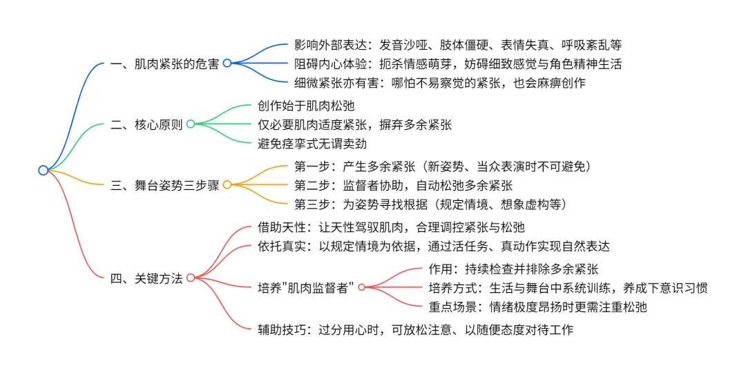 不纵对自己以及……其他演员的观察,……使我得出了某些结论,后来我又在实践中加以检验。其中首先是:在创作状态中起很大作用的是身体的学全自由,亦即使它解除掉肌肉紧张,这种肌肉紧张在我们不知不觉中不仅在舞台上,而且在生活中都支配着它,仿佛给它加上枷锁,妨碍它成为我们心理活动的听话的传导者。这种肌肉紧张在演员力求完成对他特别困难的某一舞台任务的场合达到极限,会耗掉他的全部内在精力,并把它从高级中枢的活动引开。因此在自己身上养成使身体摆脱多余紧张的习惯,意味着扫清通向创作活动的一个重大障碍。这也意味着给自己发现了这样一种可能性,就是只根据需要并且精确地按照我们的创作课题去运用我们肢体的肌肉机能。(《全集》第6卷,255页)