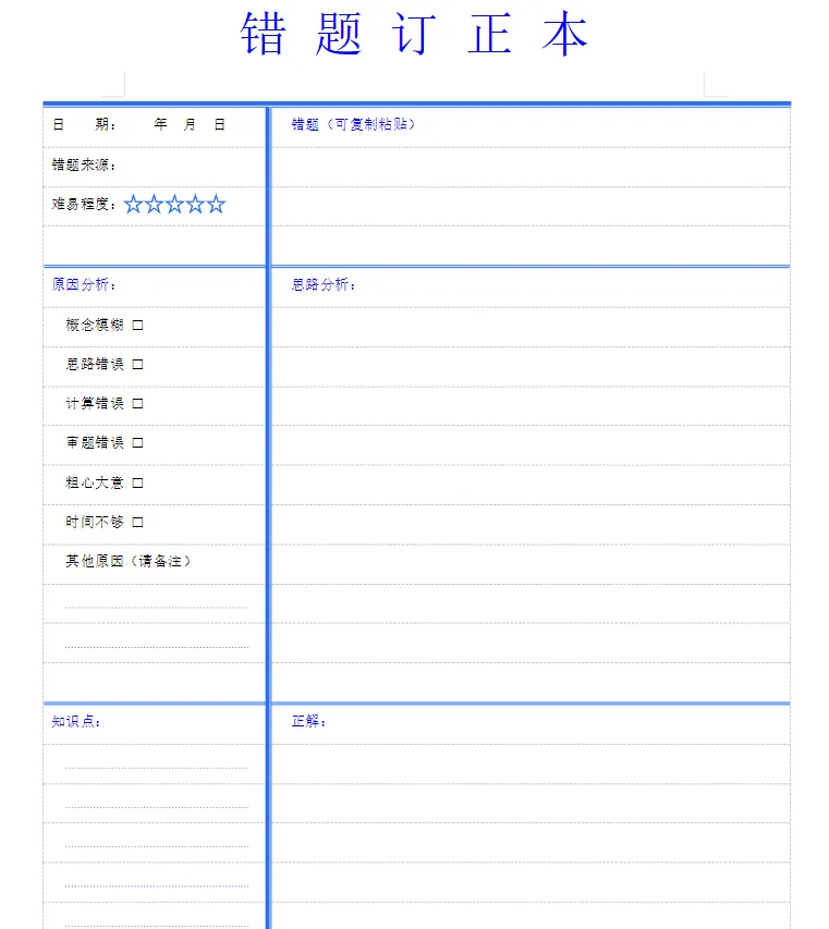 ✅ 错题本模板:按科目分类,含错题原因分析栏、举一反三区,帮孩子精准定位知识漏洞,避免"一错再错"!