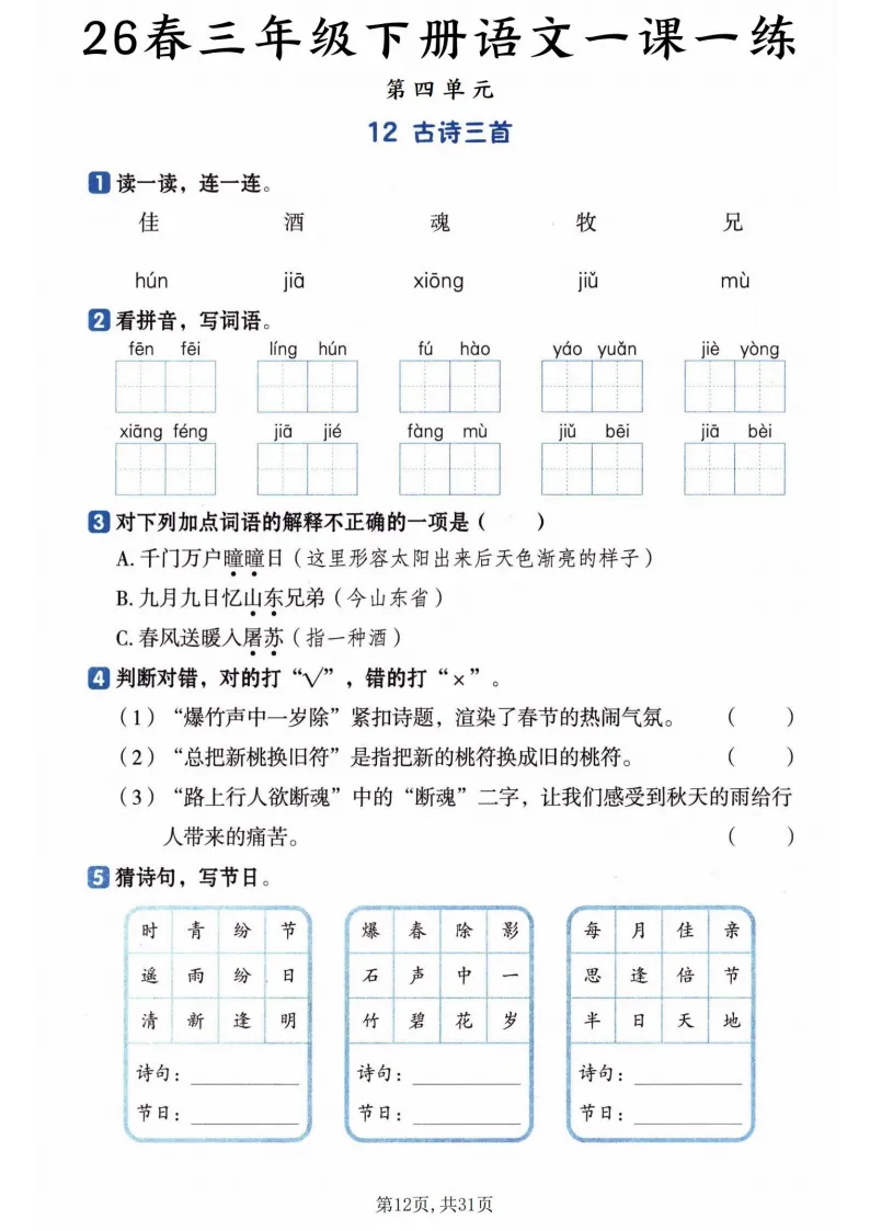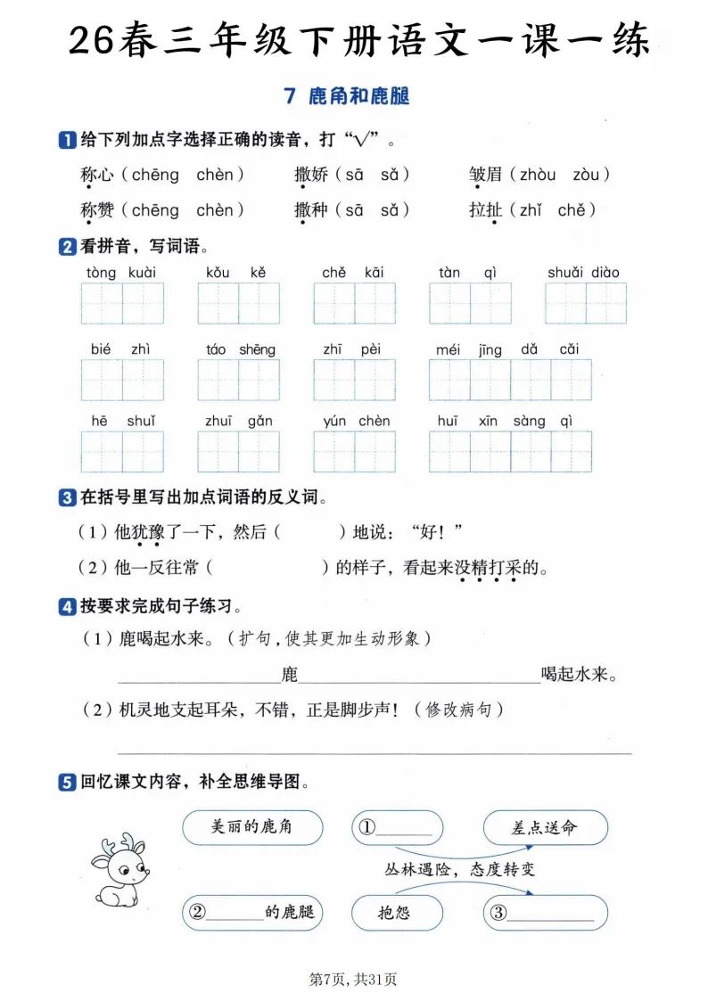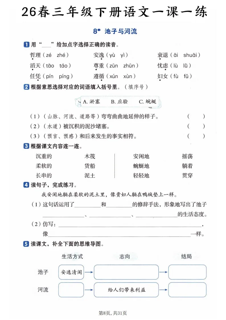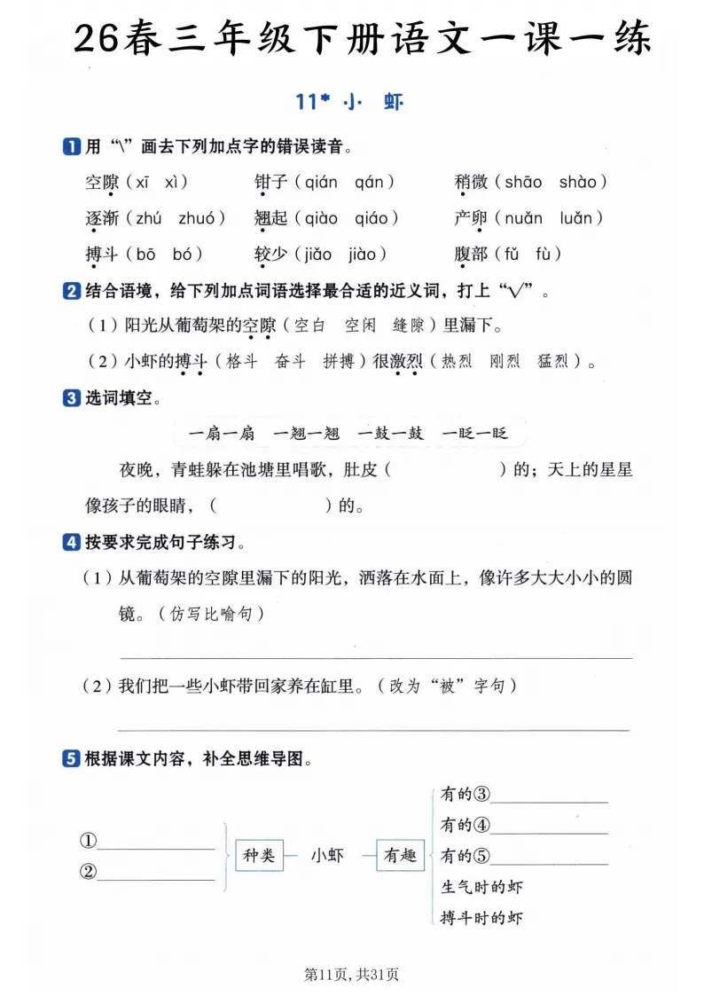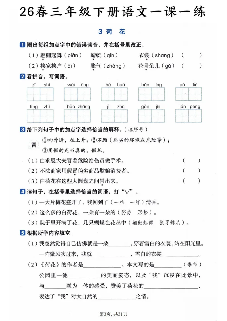 覆盖全册27篇课文,从基础到提升层层递进!拼音辨析、字词书写、课文填空、句子练习、思维导图补全全都有,每道题都对应课文重点,比如《荷花》课练里会专门考“冒”字的多义辨析,《赵州桥》会让孩子梳理建筑特点,帮娃扎实掌握知识点,预习复习都能用~