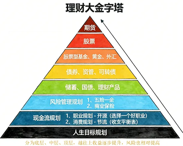 根据理财金字塔可以分成5大类理财产品分别如下: