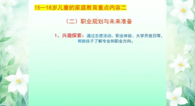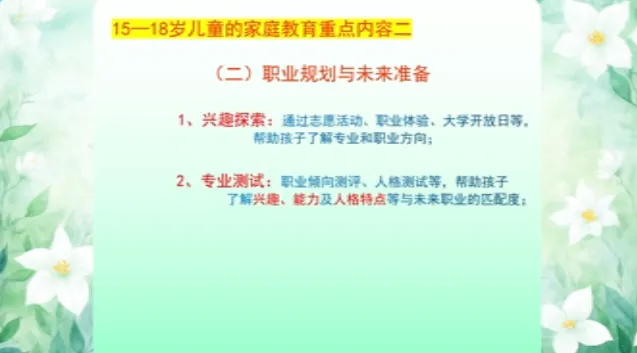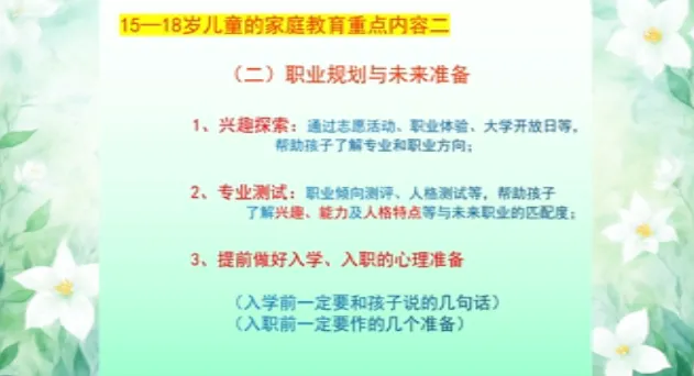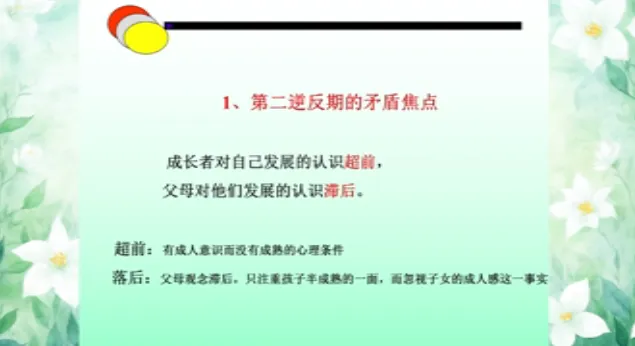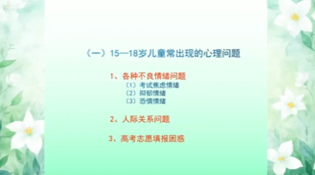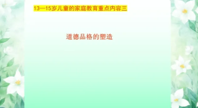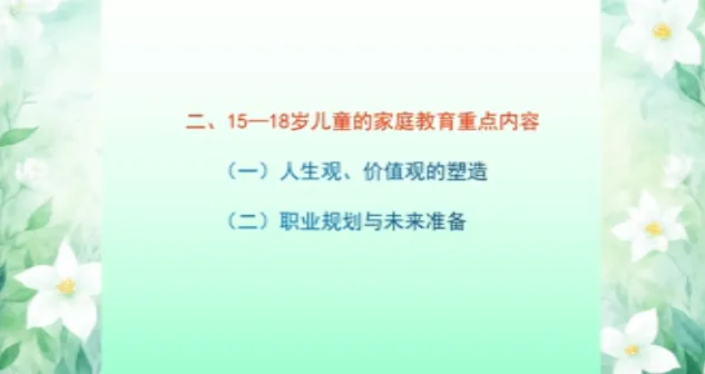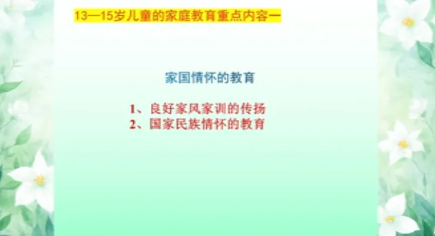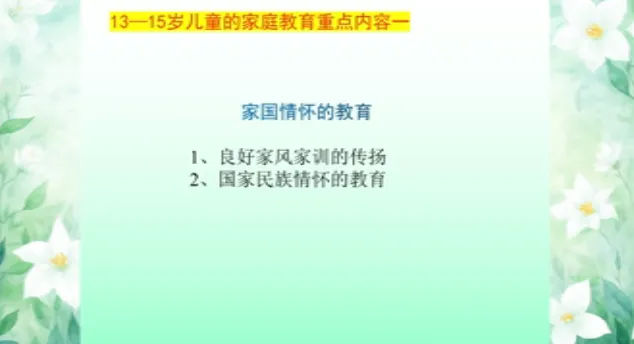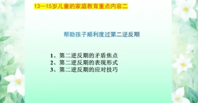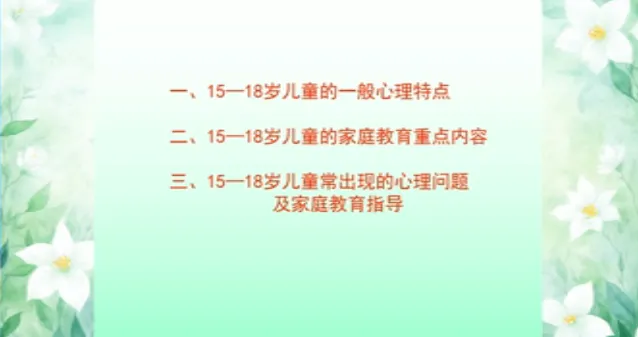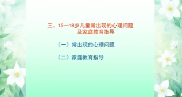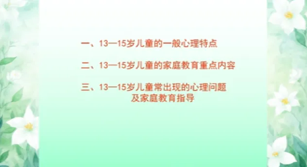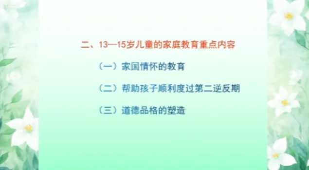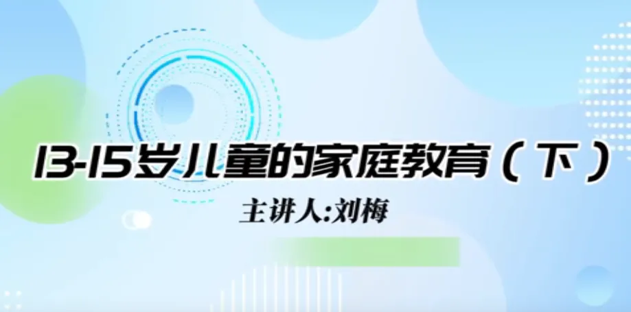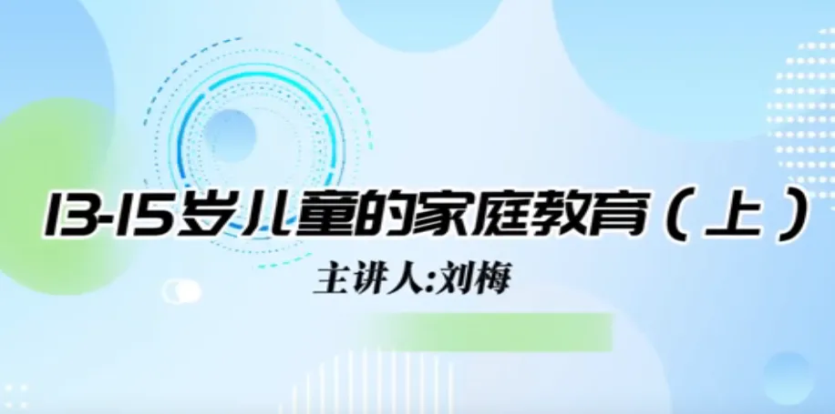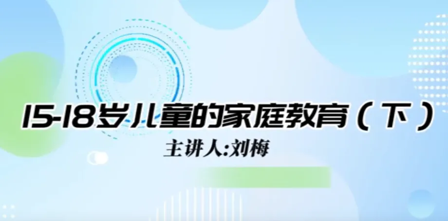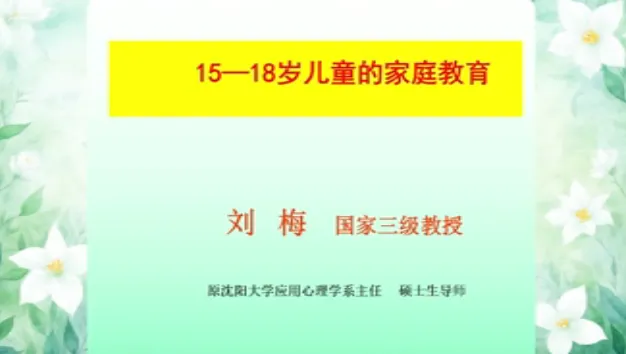 今日学习第十三课时《13-15岁儿童家庭教育》、第十四课时《15-18岁儿童家庭教育》。主讲人沈阳大学师范学院应用心理学系原主任、教授刘梅。