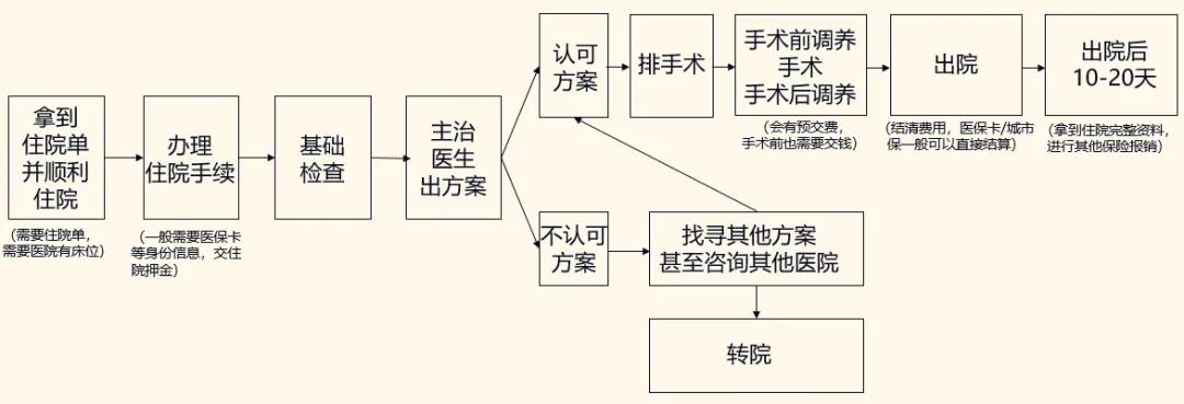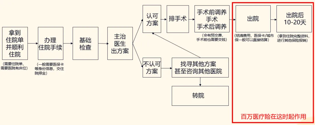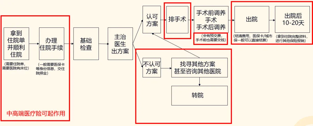 一般住院流程就像下面这张图,拿到住院单、办手续、做检查、出方案、手术排期、做手术等等。百万医疗险在住院过程中其实没有什么作用,主要是出院后,拿着住院的完整资料(比如病例、发票)去报销,也就是事后报销,在医院期间需要自费的项目先自己全部承担,出院后找保险公司/经纪人走报销流程。但是中高端医疗险带有绿通服务和各种增值服务,其作用和好处体现在整个住院流程中。住院期间陪护的家人如果没空,可以安排住院专属护工。如果不认可主治医生的方案,保司也可以通过咨询全球顶尖医疗机构组成的服务网络获取二次医疗建议。住院过程中的费用,如果有直付服务,保险公司会与医院直接结算,患者不用自己掏钱,极大缓解了家庭的经济压力。尤其对于花费大的重大疾病,直付功能真的是必不可少的。出院后,术后家庭护理也能让家人获得更专业、更细致的照顾。当然,具体的服务还是要看产品中的详细说明,不同产品包含的服务不同,但是这些服务都是为了让客户更加省心、安心、放心的。本文为个人医疗险学习笔记,仅用于知识梳理与交流,不构成任何保险购买建议或法律意见。