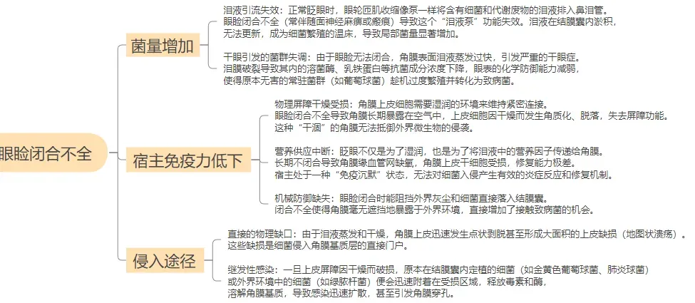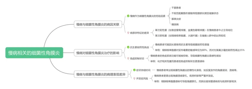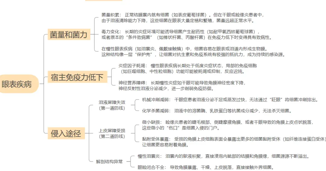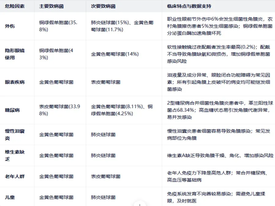 原文:3.危险因素:细菌性角膜炎常见的危险因素分为局部因素和全身因素。主要局部因素包括配戴角膜接触镜、眼外伤、手术及眼表疾病等,其他局部因素包括干眼倒睫睑内翻眼睑闭合不全疱疹病毒性角膜炎泪囊炎等。主要全身因素包括糖尿病使用免疫抑制剂以及免疫缺陷性疾病等。(笔记:细菌性角膜炎的发病有三个重要因素:特定的侵入途径、足够的菌量、宿主的免疫低下。我们从这三个角度逐个分析这些危险因素对细菌性角膜炎的影响)