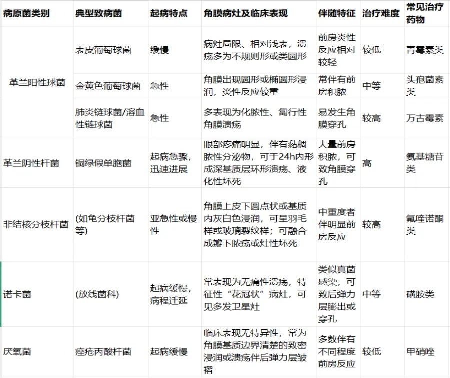 1)革兰阳性球菌性角膜炎:表皮葡萄球菌性角膜炎的角膜病灶局限且相对浅表,溃疡多为不规则形或类圆形,前房炎性反应相对较轻 。金黄色葡萄球菌性角膜炎的炎性反应较重,角膜圆形或椭圆形浸润,常伴前房积脓 。肺炎链球菌及溶血性链球菌性角膜炎多表现为急性、化脓性、匍行性角膜溃疡,易发生角膜穿孔。