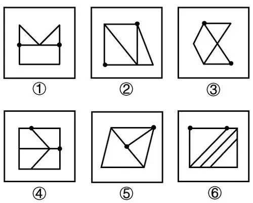 答案D:图①④⑤中,黑点标记的两个交点均发射出3条线,图②③⑥中,黑点标记的一个交点发射出3条线,另一个交点发射出2条线,即图①④⑤为一组,图②③⑥为一组。