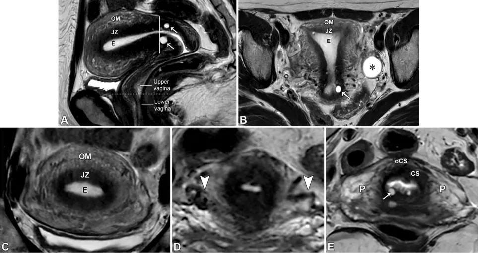 图2展示了女性盆腔MRI评估中常用的成像平面。经子宫的正中矢状面插图(A)显示了关键的MRI平面定位。A中的红线与子宫体平行,指示冠状斜位或卵巢轴的定位(如B中红线框所示),这有助于区分附件肿块的子宫起源和卵巢起源,并勾勒出子宫底的外轮廓,这在评估苗勒管畸形时具有重要意义。A中的黄线与子宫体垂直,显示子宫轴位斜平面的定位(如C中黄线框所示)。该平面用于评估子宫内膜癌分期中的肌层浸润深度,或显示子宫平滑肌瘤的位置。A中的灰线与宫颈垂直,代表宫颈轴位斜平面的定位(如D中灰线框所示),这对评估宫颈癌分期中的宫旁浸润至关重要。最后,A中位于膀胱颈水平的蓝色虚线将阴道分为上三分之二和下三分之一,这一区分对宫颈癌分期很重要。E=子宫内膜,iCS=宫颈内基质,JZ=交界区(子宫内肌层),oCS=宫颈外基质,OM=子宫外肌层,P=宫旁组织。图3,一名46岁女性患者在T2加权图像上子宫体和宫颈的正常表现。矢状位(A)、斜冠状位(B)、子宫斜轴位(C)、峡部斜轴位(D)和宫颈斜轴位(E)图像显示了子宫和宫颈的正常分区解剖结构。如A-C所示,位于中央的高信号子宫内膜(E)被低信号的结合带(JZ,即子宫内肌层)和中等信号强度的子宫外肌层(OM)所环绕。峡部标志着子宫颈连接处以及内口的位置,其特征为子宫外部轮廓变窄、宫颈管在通入子宫内膜腔之前呈漏斗状(A),以及子宫血管的入口(D中的箭头)。在矢状位T2加权图像(A)上,水平放置于膀胱颈的虚线将阴道的上三分之二与下三分之一区分开来,这一区分与宫颈癌分期相关。注意宫颈内的小纳博特囊肿(A、B和E中的箭头),以及左卵巢内的T2高信号卵泡(B中的*)。iCS=宫颈内间质,oCS=宫颈外间质,P=宫旁组织。教学要点:磁共振成像(MRI)能提供卓越的解剖学细节,多平面T2加权成像则是解剖学评估的基础。放射科医生必须透彻理解女性骨盆解剖结构,才能有效解读盆腔MRI。- 腹膜外间隙内有器官、肠系膜和结缔组织。腹腔内器官完全被腹膜包裹,而腹膜外器官则位于腹膜外间隙(图4)。
