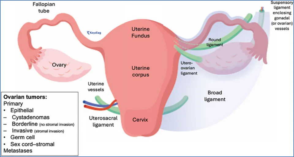 膀胱子宫陷凹和直肠子宫陷凹由覆盖膀胱顶、子宫体和直肠的腹膜反折形成(28,29)。直肠子宫陷凹的后缘衬有腹膜前反折,分隔腹膜内直肠和腹膜外直肠,表现为一条薄的T2低信号线(图4)(30)。 腹膜外器官分为前间隙、中间间隙、后间隙和双侧骨盆侧壁(图4)(28,29,31)。前间隙包括膀胱以及膀胱前间隙和膀胱周围间隙(图5)(32,33)。膀胱、脐正中韧带(闭锁的脐尿管)和脐内侧皱襞被脐筋膜包裹,形成膀胱周围间隙。膀胱前间隙位于膀胱的前方和侧方,耻骨联合后方为Retzius耻骨后间隙。中间腔室包含子宫和阴道。子宫由阔韧带支撑,阔韧带是成对的双层腹膜皱襞,延伸至盆腔侧壁和盆底(图 6)(29,34)。在 T2 加权成像中,阔韧带通常不明显,除非有腹水勾勒出其轮廓。阔韧带分为三部分:子宫系膜(位于外侧,支撑子宫体)、输卵管系膜(位于上方,支撑输卵管)和卵巢系膜(位于后方,支撑卵巢)。它们包裹着子宫、输卵管、近端圆韧带、卵巢韧带以及子宫血管和性腺(卵巢)血管。圆韧带是 T2 低信号的绳索状纤维肌性结构,从子宫角沿着髂外血管的前内侧延伸,穿过腹股沟管,到达大阴唇前部和阴阜(图 5)(29,34)。子宫骶韧带和主韧带分别将子宫 torus(子宫颈后外侧交界处)、宫颈和阴道上段固定于骶前组织和盆腔侧壁(29,34)。在 T2 加权成像中,主韧带不明显,其内部包含子宫血管;而子宫骶韧带是成对的纤细 T2 低信号带,从子宫 torus 延伸至骶前组织(图 5)(29)。图 6. 冠状面示意图展示了子宫、卵巢、输卵管以及支持性结缔组织。子宫由阔韧带支撑 —— 阔韧带是成对的、翼状的双层腹膜皱襞,延伸至盆腔侧壁和盆底。卵巢由卵巢韧带、卵巢系膜(将卵巢固定于阔韧带,图中未显示)和悬韧带(将卵巢连接至盆腔侧壁并包裹卵巢血管)支撑。阔韧带内包含输卵管、圆韧带、卵巢韧带以及子宫和卵巢血管。宫骶韧带将子宫圆枕(子宫颈后外侧交界处)连接至盆腔侧壁,是深部子宫内膜异位症最常见的发病部位。子宫血管在子宫峡部(子宫体与子宫颈的移行处)接近子宫。插图框描述了最常见的卵巢肿瘤类型。