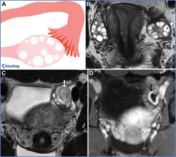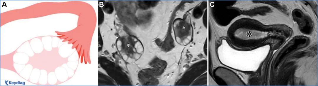 卵巢——卵巢是可活动的腹膜内器官,由卵巢韧带(连接卵巢与子宫角)、卵巢系膜(将卵巢固定于阔韧带)和悬韧带(连接卵巢与盆腔侧壁并包裹性腺血管)支撑(图6)(36)。性腺动脉起源于肾动脉下方的腹主动脉;右侧性腺静脉汇入下腔静脉,左侧性腺静脉汇入左肾静脉。性腺静脉直径大于0.8厘米为异常,尽管性腺静脉直径与静脉反流之间的相关性较差(37)。性腺血管走行于腰大肌前方、输尿管外侧。 卵巢的表现随月经周期阶段和绝经状态而变化。绝经前卵巢为较大的椭圆形结构,在T2加权成像上能清晰显示分区解剖结构,包括T2低信号的皮质、T2等信号的髓质(含疏松排列的基质和血管)、T2高信号的薄壁卵泡,偶尔可见黄体(19,38)。黄体因有黄素化的卵泡膜细胞而呈现T2等信号的厚壁,在退化过程中会变得锯齿状。非出血性黄体中央呈T1低信号、T2高信号,而出血性黄体中央呈T1和T2高信号,有时可见血细胞比容平面。静脉注射对比剂后,卵巢皮质和基质轻度强化,强化程度低于子宫肌层,而黄体壁则表现为早期明显强化(38)。绝经后卵巢比绝经前卵巢小,皮质和髓质呈T2等信号至低信号,偶尔可见小囊肿(38)。表S2以及图7-10详细描述了常见的生理性和其他良性卵巢表现的MRI特征(19,38-42)。图7. 两位不同患者的正常经前卵巢,突出显示了生理学观察结果。(A)示意图显示了带有卵泡的经前卵巢。(B)一位27岁女性患者的轴位T2加权图像显示一个椭圆形卵巢,具有T2低信号皮质(箭头)、T2等信号髓质(白色*)和多个T2高信号卵泡(黑色*)。(C、D)一位30岁女性患者的轴位T2加权(C)和对比增强脂肪抑制T1加权(D)图像显示了黄体(CL),这是经前女性常见的生理学表现。其影像学表现随发育阶段而变化。典型的黄体在T2加权成像上表现为囊性结构,中心呈高信号,壁厚且呈锯齿状,信号强度中等(C中的箭头),在静脉注射造影剂后明显强化(D中的箭头)。图8. 一名34岁闭经女性患者的多囊卵巢综合征与继发性非典型子宫内膜增生。(A)示意图展示了多囊卵巢,这是一种常见的内分泌疾病,影响高达10%的育龄女性。多囊卵巢综合征的诊断依据Rotterdam标准,该标准要求满足以下三项中的至少两项:多囊卵巢、月经稀发或无排卵,以及高雄激素血症。多囊卵巢的定义为:至少一侧卵巢的体积达到10毫升或以上,或者每个卵巢有20个或更多的卵泡(详见表S2)。(B)轴位T2加权图像显示双侧多囊卵巢增大,中央为T2等信号基质(小*),周围有多个T2高信号卵泡。(C)矢状位T2加权图像显示子宫内膜腔内呈不均匀的T2等信号(大*),对应活检证实的非典型子宫内膜增生。在所有增强后序列(包括延迟图像,未显示)中,非典型子宫内膜增生的强化程度低于子宫肌层,这与子宫内膜癌的强化模式相似。图9. 一名27岁女性患者的右侧卵巢扭转,该患者表现为急性盆腔疼痛。轴位T2加权图像显示右侧卵巢(RO)增大且水肿,伴有外周卵泡(箭头所示)。与正常的左侧卵巢(*)相比,右侧卵巢位置异常,位于子宫(U)的中央后方。卵巢扭转的其他表现(未显示)可能包括血管蒂扭转以及强化程度不一,这取决于缺血程度或是否存在梗死。图10. 一位43岁女性患者的输卵管卵巢脓肿,该患者在子宫内膜活检后出现恶心、呕吐和盆腔疼痛症状。轴位T2加权像(A)和对比增强脂肪抑制T1加权像(B)显示左侧附件区有一个多房囊性肿块。该肿块内含有脓性液体,在T2加权像上表现为不同的信号强度(A中的*),并具有增厚的强化壁以及多个强化分隔(B中的箭头)。高b值扩散加权像和ADC图(未显示)显示扩散受限,与脓液的存在相符。经皮引流后获得的细菌培养结果显示大肠杆菌阳性。——输卵管从子宫角延伸至卵巢(39)。近端的壁内部分穿过子宫肌层;远端带有伞端的漏斗部开口于卵巢附近的腹膜腔。输卵管被阔韧带的输卵管系膜包绕(图6)。在MRI上,它们表现为卵巢和子宫之间的T2低信号管状结构。子宫体和宫颈解剖。——子宫由子宫体和宫颈组成,宫颈下段(或子宫颈外口部)突入阴道上部(图2、3)(24、25、43)。在T2加权成像上,绝经前子宫的子宫体(子宫内膜、结合带和外肌层)和宫颈(宫颈管、宫颈内间质和宫颈外间质)均显示出清晰的分区解剖结构。绝经后或接受放射治疗后,这种分区解剖结构会变得不清晰(24、25、43)。子宫内膜腔由均匀的T2高信号子宫内膜衬里,延伸至同样为T2高信号的宫颈管(38)。子宫内膜厚度在子宫矢状面中部沿子宫长轴测量,其数值会随绝经状态和月经周期阶段而变化(表S3)(38、44-49)。对于有绝经后出血的患者,子宫内膜厚度≥5mm为异常;而无症状患者的阈值则不太明确(50)。结合带(子宫内肌层)呈T2低信号,向尾侧延续为T2低信号的宫颈内纤维间质。子宫外肌层呈T2等信号,过渡为宫颈外间质的T2等信号。正常结合带厚度≤8mm,若无微囊肿则可达11mm(45)。 子宫峡部是子宫体与宫颈之间的过渡区,在矢状位T2加权成像上表现为局限性缩窄,在轴位斜向T2加权成像上可见子宫血管进入(图2、3)(24、25)。宫颈内口和外口分别是宫颈管的上下开口。宫颈围绕宫颈管,包括上皮衬里和宫颈间质(43)。宫颈上段由腺状柱状上皮覆盖,宫颈下段(包括子宫颈外口部)由鳞状上皮覆盖。鳞状上皮与柱状上皮的交界处(鳞柱交界)在生育年龄具有动态变化,是大多数宫颈癌前病变和宫颈癌的起源部位。宫旁组织由主韧带和宫骶韧带构成,从宫颈两侧延伸至盆侧壁,包绕子宫血管、神经和输尿管(图2、3