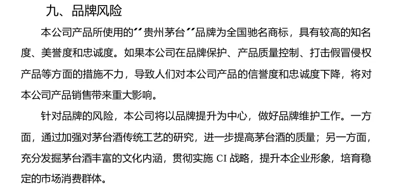 第九个风险因素(图1)是“品牌风险”,本公司使用的“贵州茅台”品牌为全国驰名商标,具有极高的知名度、美誉度和忠诚度。如果公司在品牌保护、产品质量工作、打击假冒侵权产品等方面的措施不力,导致人们对本公司产品的信誉度和忠诚度下降,将会对公司产品销售带来重大影响;