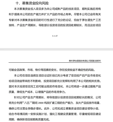 第十个风险因素(图2)是“募集资金投向风险”,本次募集资金投入项目多为公司成熟产品的技改项目,顺利实施后将有助于提高本公司的生产能力并扩大产品的市场占有率;尽管本公司已经会同专家对本次募集资金项目的可行性进行了充分论证,但由于茅台酒生产工艺独特,产品生产周期长,导致部分投资项目的投资回收周期较长,而这些项目可能会因政策、市场、物价等因素的变化,存在投资收益不确定性的风险。
