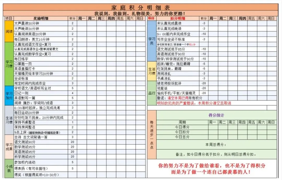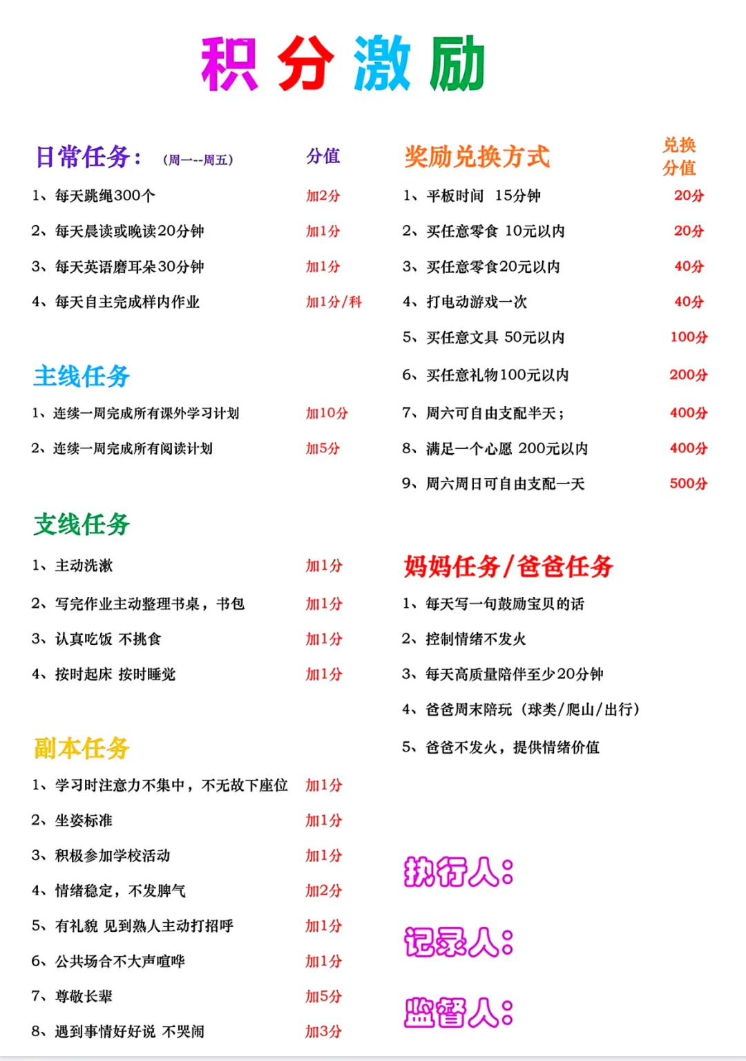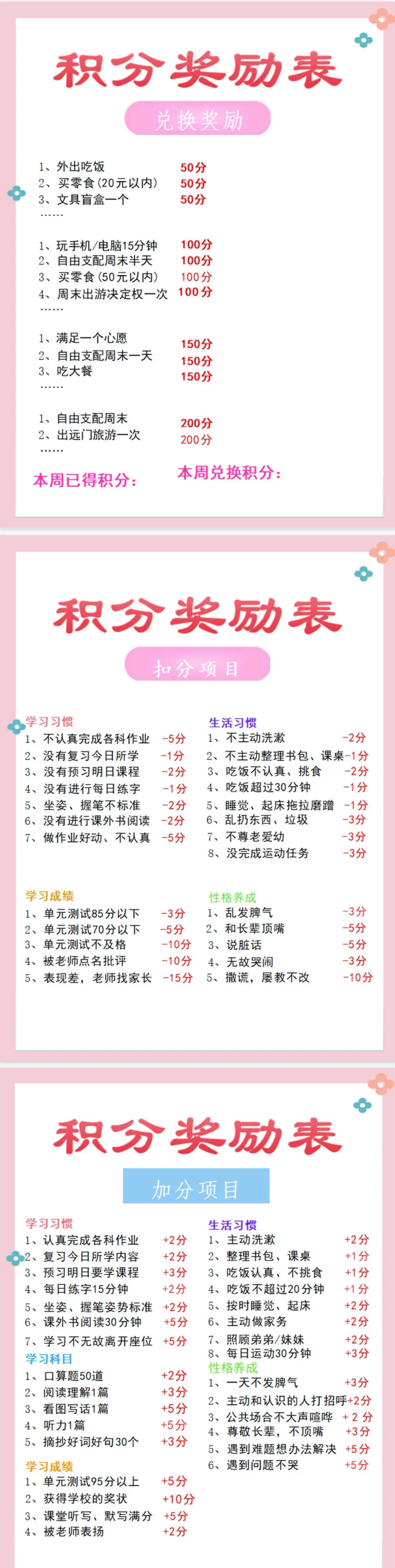 小学学习资料|家庭奖惩积分表、学霸养成、积分兑换表(高清下载打印)