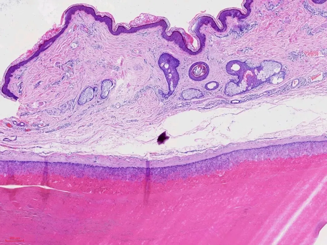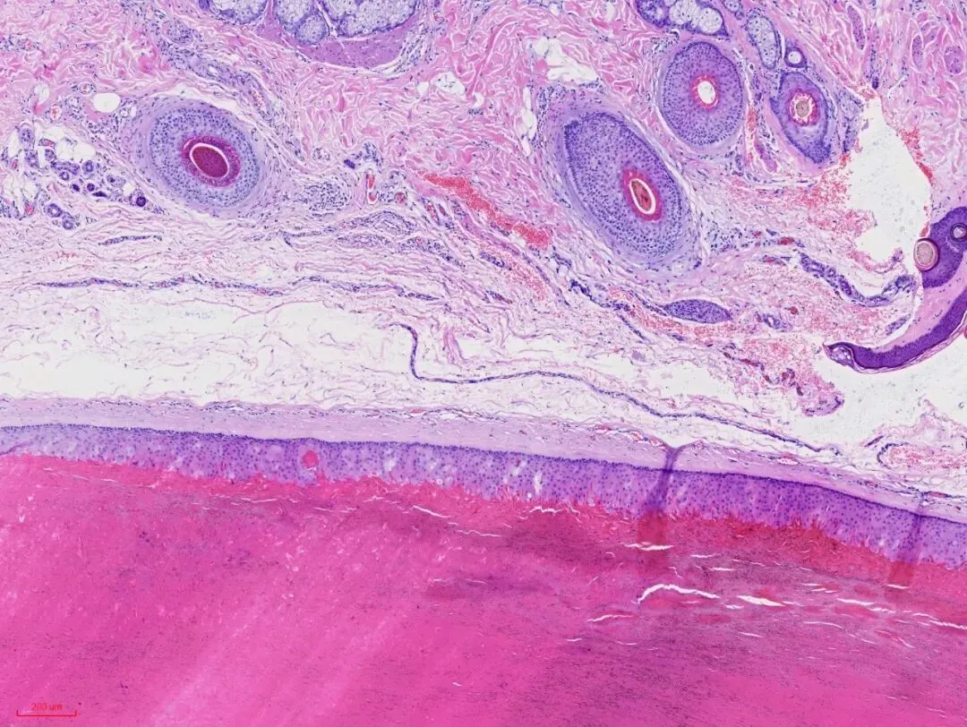 ②除表皮外,含有皮肤附属器(如毛囊、皮脂腺、汗腺)。