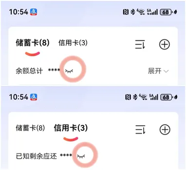 点击小眼睛,可以看到储蓄卡的余额、信用卡的账单和日期