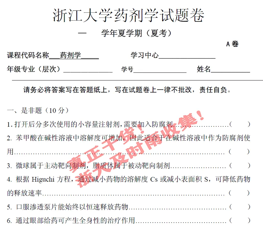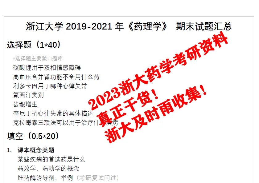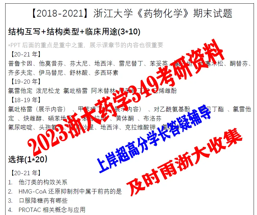 浙大改考四大药:药剂、药理、药分、药化。所以之前考的有机和生化真题资料价值已经不大了,为此我们浙大及时雨特联合浙大学长学姐们共同努力,收集出了一套目前所有能收集到的浙大药学考研资料和浙大本科资料:新大纲浙大考研高分看家笔记、期末试题、课件讲义、题库习题集、重点考点、总复习资料等等。学长学姐们废了很大精力才收集到如下资料,十分珍贵!