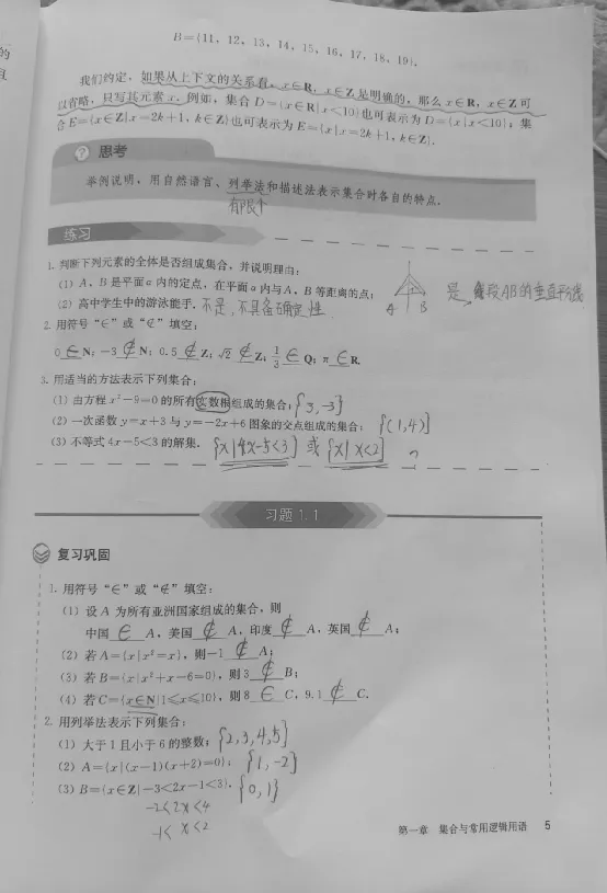 在教材的第5页有一个思考题:举例说明,用自然语言、列举法和描述法表示集合时各自的特点。看到这里我想落笔写点什么,但是不知道怎么写,只知道用列举法表示的集合应该是有有限个元素的,描述法表示的集合中的元素是不可数的,不能一一列举出来的,但用自然语言表示的集合的特点是怎样的呢?我不不能组织语言表达出来。