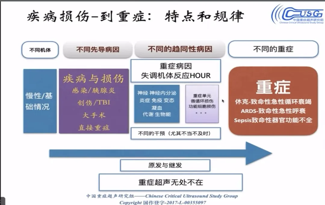 刘老师在05年就反复跟大家说,不同的疾病损伤导致机体向死亡发展,什么叫导致机体呢?疾病损伤本身并不让病人死亡,但可以导致机体向死亡发展,而这个过程就是重症的过程,所以说重症是死亡前的暂停时刻,重症呢又不等于死亡,重症反而是给大家提供的救治机会。