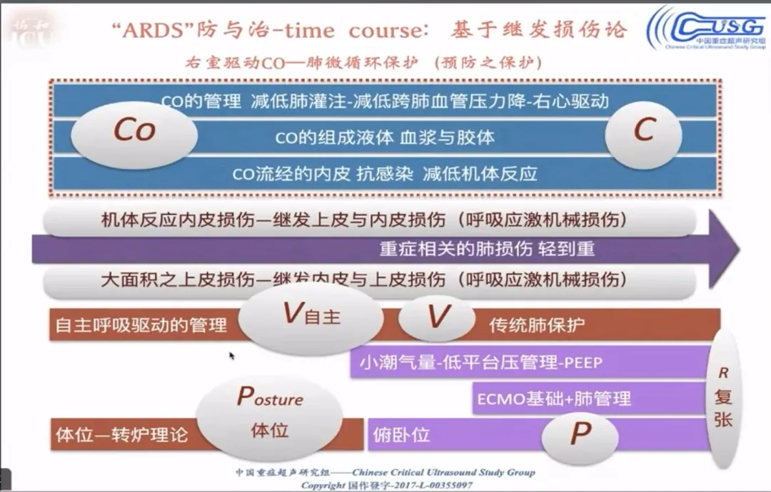 ARDS 作为重症的典型代表,其防治核心是基于继发论的保护策略,核心是3PCVP 原则(循环 C、通气 V、体位 P),最终目标是控制右心驱动,减少肺损伤,具体内容如下: