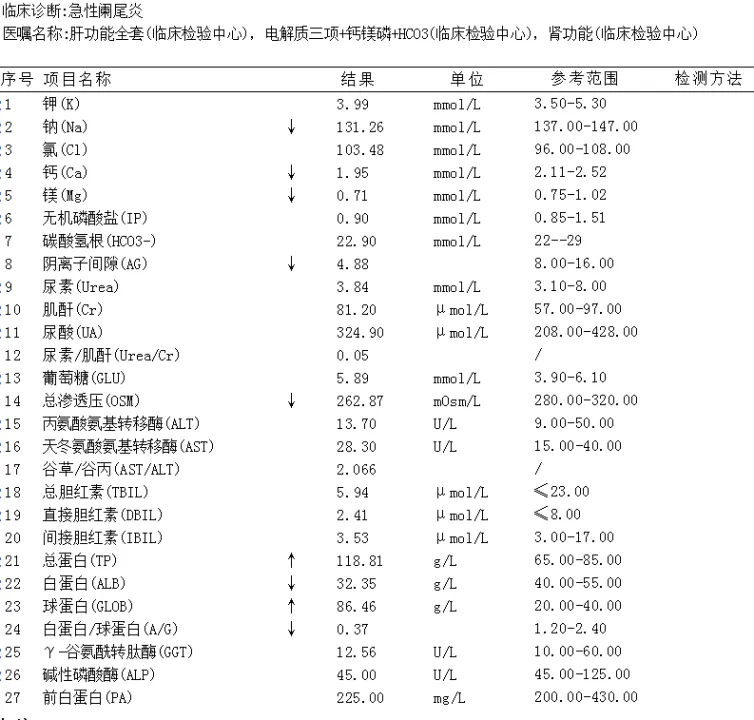 而临床的初步诊断:腹痛原因:急性阑尾炎?、消化道穿孔?;泌尿系结石?入院后立即进行了相关检查,其中生化检查结果如下: