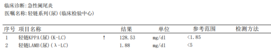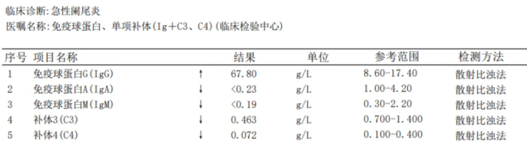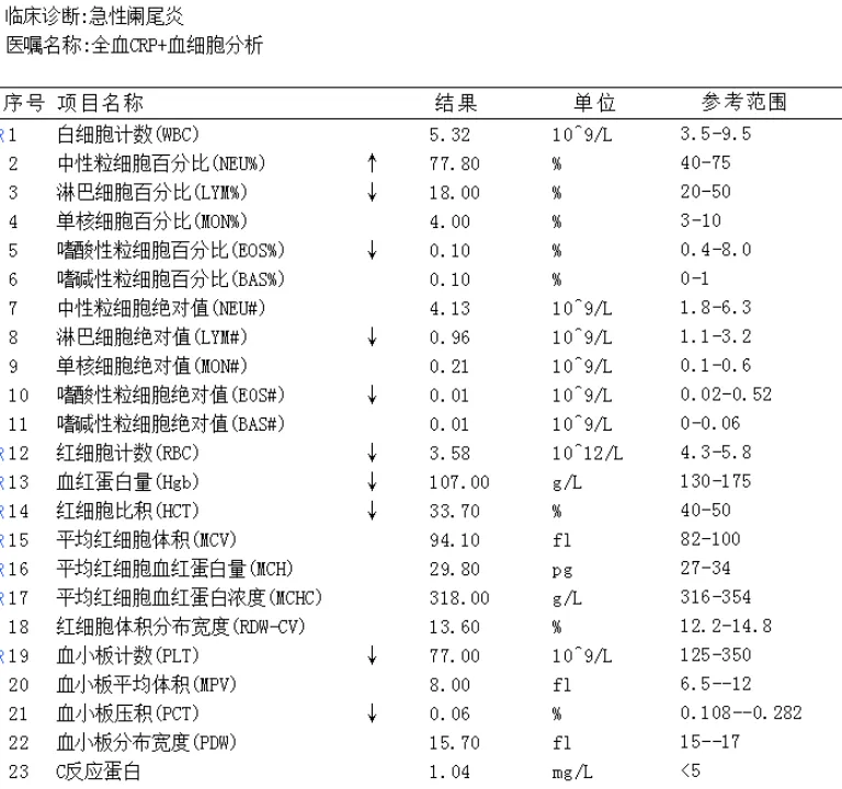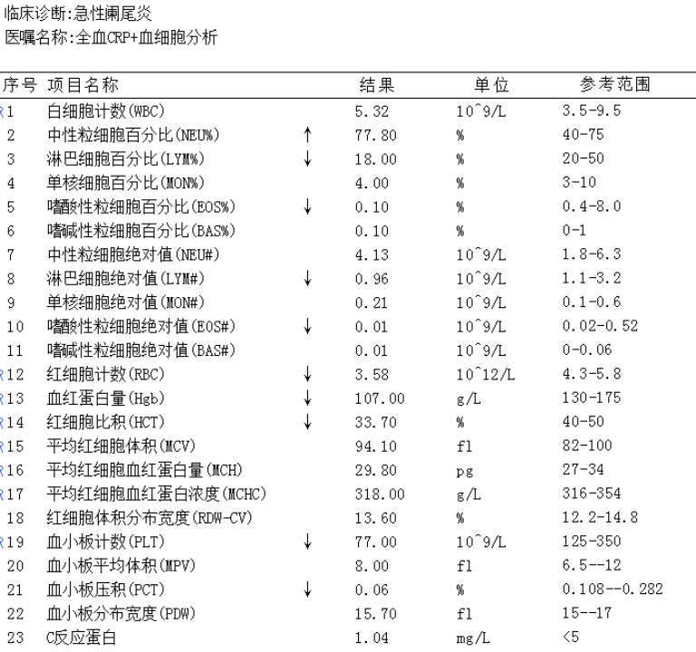 可以看到患者多项指标均有异常,但主要反映肝功能(ALT和AST、TBIL和DBIL)和肾功能(尿素和肌酐)的指标均正常,当然引起我注意的就是患者蛋白结果的异常,其中球蛋白异常增高,而白蛋白却下降,白球比明显下降,一个腹痛患者为什么白蛋白和球蛋白会如此的异常,因为对于急性阑尾炎来说,其诊断标准主要依据的是患者的临床表现,体格检查以及相关辅助检查(当然主要是指影像学检查),而实验指标最大变化的可能是血常规的白细胞计数以及C反应蛋白的异常,于是查看了患者的血常规结果: