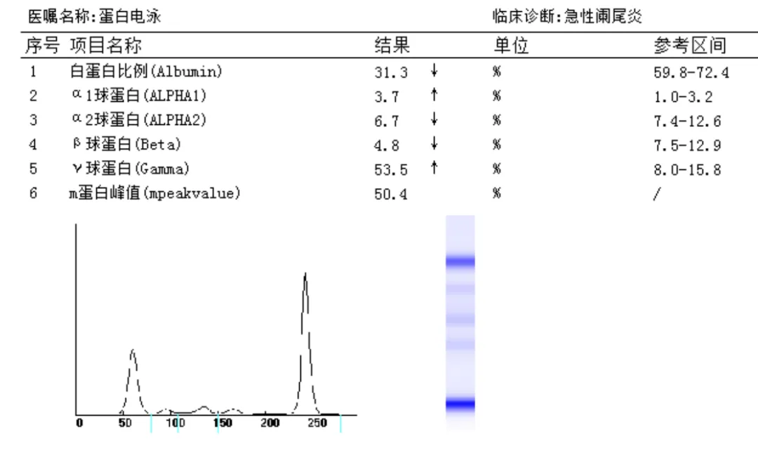 可以看到患者白细胞并没有升高,但是患者红细胞、血红蛋白、以及血小板均有下降,结合患者白球蛋白结果的异常,虽然临床病史并没有提及相关的疼痛表现,对于经常做生化检验的同行们来说,肯定会联想到该患者会不会还有其它相关的血液系统疾病引起白球蛋的异常,于是我们通过他的生化血给他加做了一下血清蛋白电泳: