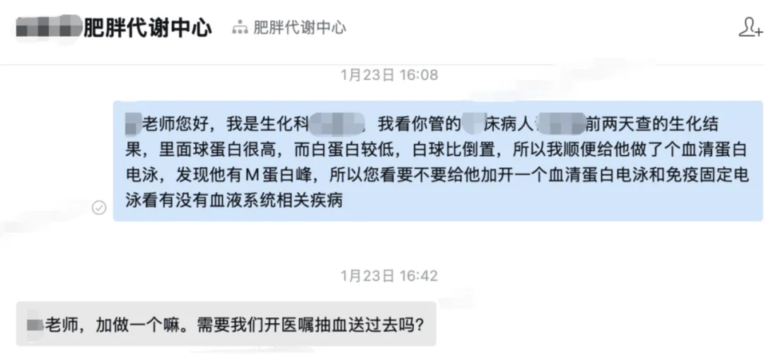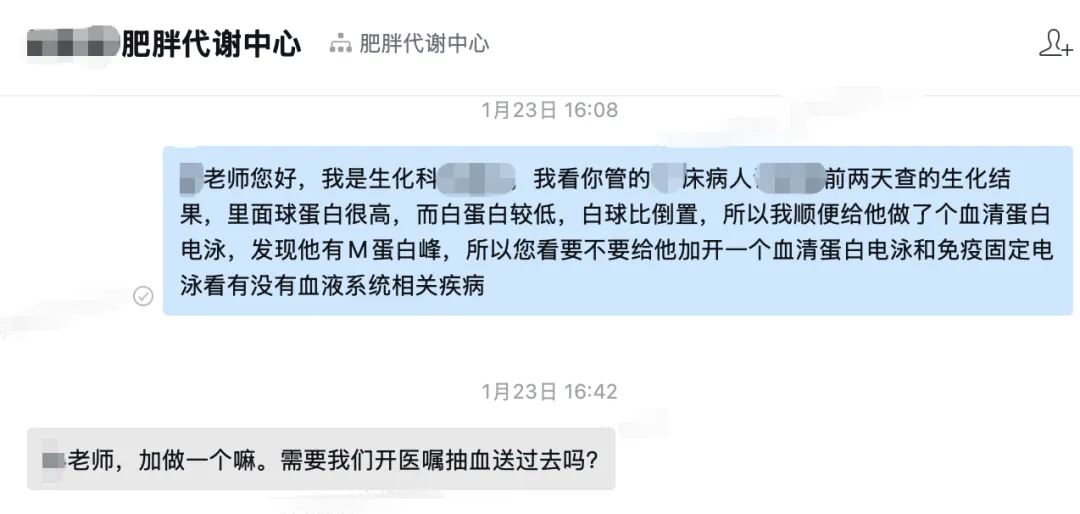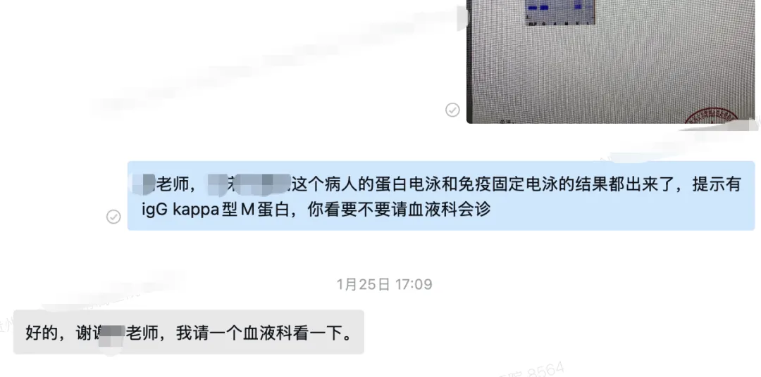 从加做的血清蛋白电泳结果不难发现,患者有明显的M蛋白峰,且其峰值占总蛋白比例极高,通过换算的其浓度59.88g/L,已经是很高浓度了,于是我通过企业微信找到管床医生,跟他说我的想法和建议