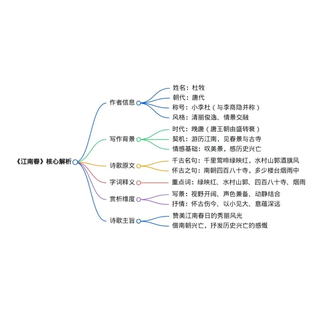 这首诗仅二十八字,却以小见大、情景交融,将江南春日的美景与历史感慨融为一体,是七言绝句中的千古佳作,可从两个层面赏析: