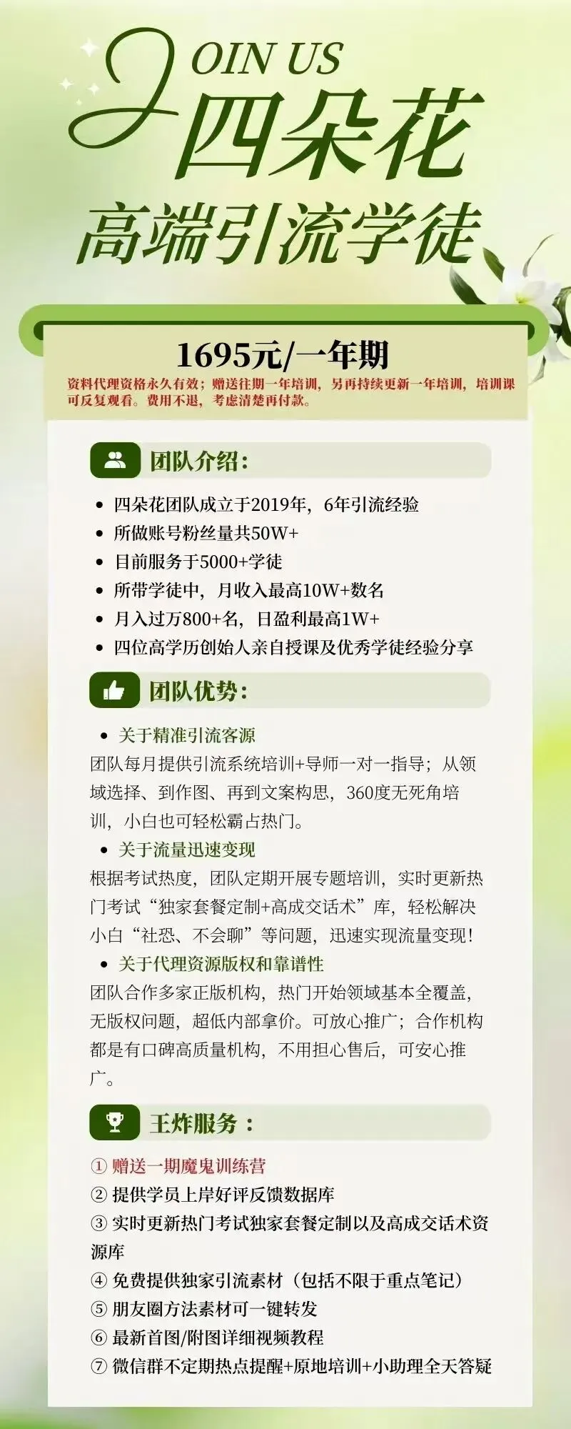 说明:资料代理资格永久有效,引流培训等相关服务一年有效期。