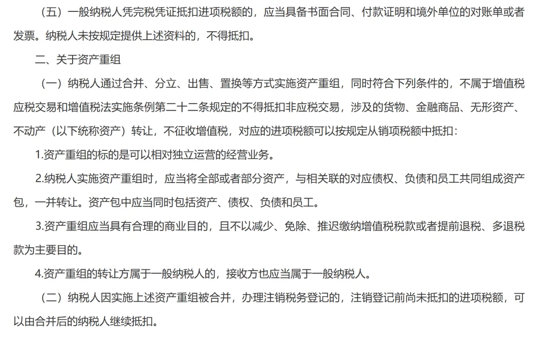 甲公司这个月需要从总进项税额中转出 40,000 元,这部分不能抵扣。剩下的可抵扣进项税额 = 100,000 − 40,000 = 60,000 元。小编叨叨:资产重组增值税不征税范围(大幅扩容)