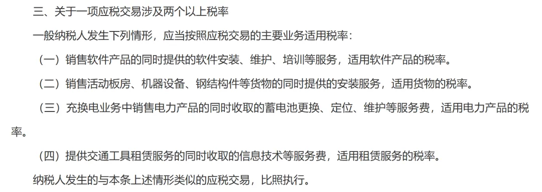 完整落地TOGC(持续经营业务转让)规则:转让完整业务资产包(资产 + 债权 + 负债 + 人员),同时, 金融商品、无形资产(不含土地)也纳入不征税范围,实现全品类覆盖。旧政策处理:国泰君安换股吸收合并海通证券,“自本次吸收合并交割日起,存续公司承继及承接海通证券的全部资产、负债、业务、人员、合同、资质及其他一切权利与义务”。企业在进行重组时,重组资产不仅仅有货物、不动产、土地使用权,可能还会有探矿权、专利等无形资产以及上市公司股票。查阅海通证券2023年年报得知,交易性金融资产期末余额2212亿元,其中股票357亿元。当时重组,大部分是应征增值税的金融商品,税负高。新政策处理:符合条件的整体业务转让,无形资产、金融商品也在不征收增值税范围内,并且可正常抵扣对应进项,税负显著降低。小编叨叨:旧政策下,对于以上业务或有争议或者企业通过合同来进行拆分,分别计税,达到少缴纳税款的目的,新政策下统一按主要业务适用税率,不拆分、不从高,附属服务依附主业务计税。1、销售软件 + 安装 / 维护 / 培训,按“销售软件产品 13%”统一计税2、销售活动板房 /机器设备 / 钢结构 + 安装,按“销售货物 13%”统一计税3、充换电 + 电池更换 / 维护等, 按 “销售电力 13%”统一计税4、交通工具租赁 + 信息服务费,按“销售租赁服务税率”统一计税小编叨叨:
