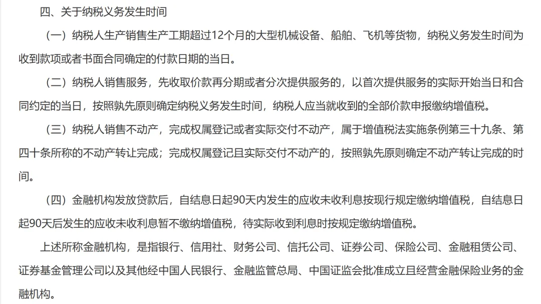 - 和之前政策一致,收到款项或书面合同确定的付款日期当日为纳税义务发生时间。