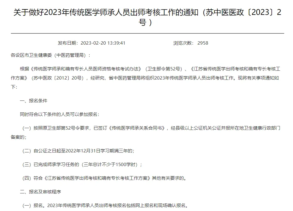 比如江苏省,2023年进行的师承出师考试,要求自公证之日起至2022年12月31日学习期满三年,才可进行报考,考试报名时间为3月1日~15日,基本和往年一致。