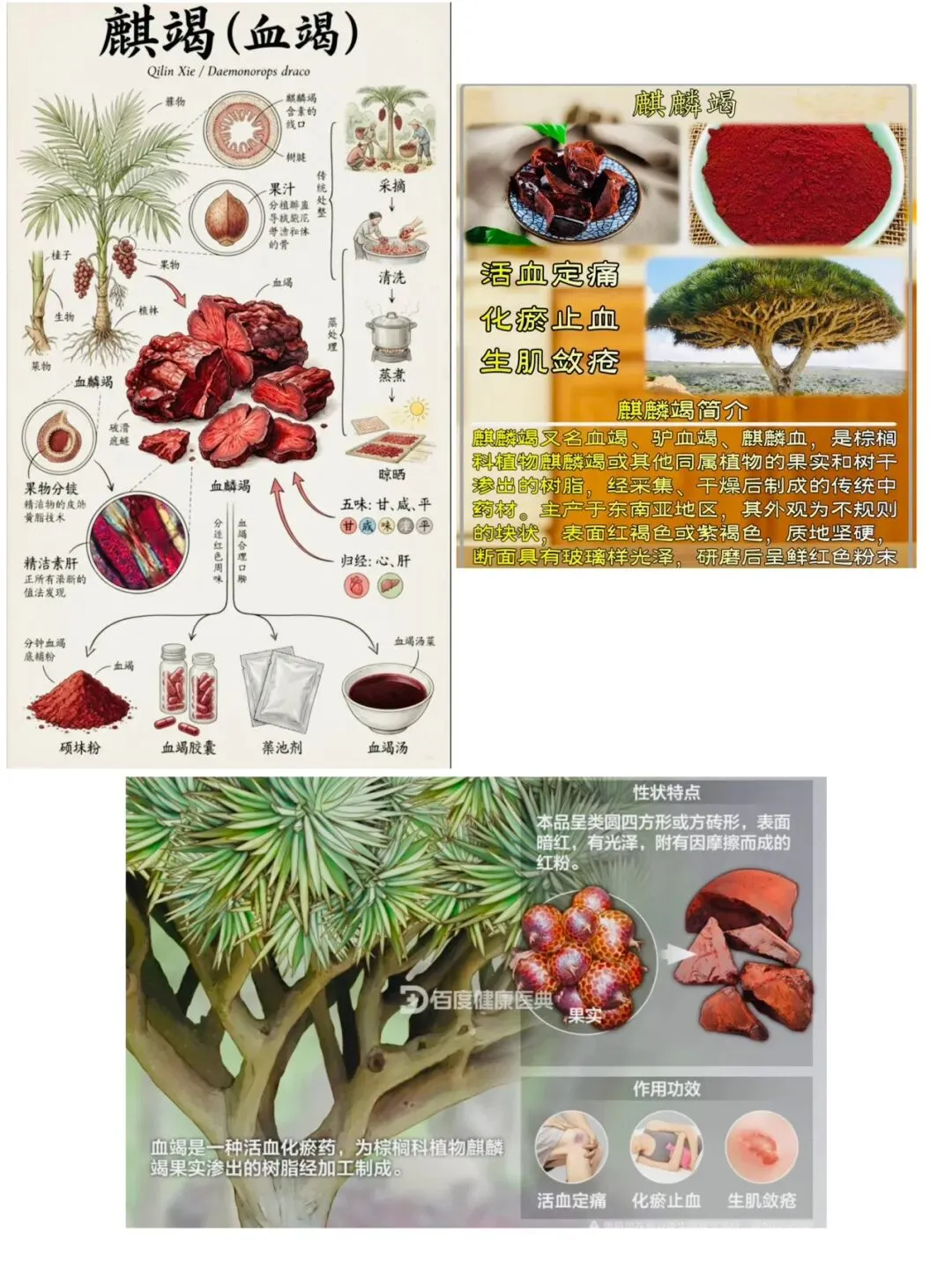 1)来源与性味:棕榈科麒麟竭果实渗出的树脂加工而成。性味:甘、咸,平。功能:活血定痛,化瘀止血,生肌敛疮。