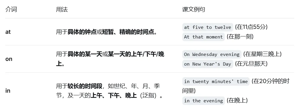 语法核心:时间表达法(尤其是介词at/on/in的用法); “to”在时间中的特殊表达
