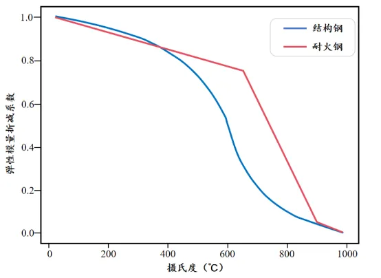 弹性模量:常规结构钢,在高温下其弹性模量折减系数计算公式如下: