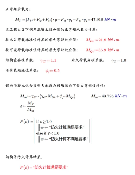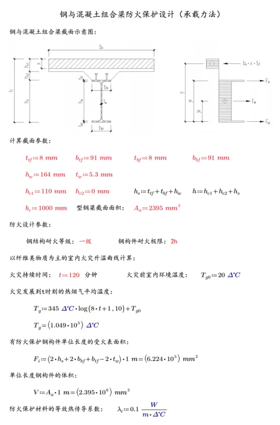 本工程是小刘前几年接触的一个项目,项目地点在海外,由于当时常规的设计软件还不支持组合截面的防火计算,因此小刘通过Mathcad编制了一个计算书,在此以某跨钢梁为例分享给大家: