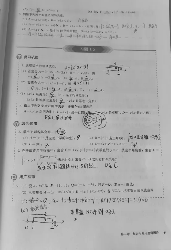 在学习这一节内容时还需要做一个很重要的辨析:那就是属于关系和包含关系的区别。这一点在教材第8页的思考题中有谈到,我的理解是包含关系针对的是集合与集合的关系,而属于关系是元素与集合的关系,它们所针对的研究对象是不一样的,因此在做课后练习的第2题和习题1.2的第1题时需要重点关注题目到底研究的是哪两个概念之间的关系。
